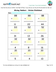 In this missing numbers worksheet, students find the missing dividend of given division problems. This twelve-page worksheet contains approximately 144 problems.