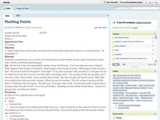 Eighth graders practice plotting points on a coordinate plane. As a class, they create and label the parts of a graph. Given ordered pairs, they plot the points, connect them to reveal a particular shape, and find the area of the shape.
