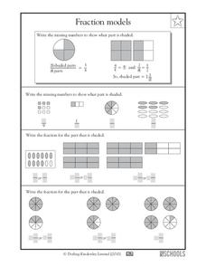 Approach fractions with these visual models which serve to reinforce numerators and denominators as well as simplifying improper fractions. Scholars examine segmented shapes and fill in a fraction to represent the shaded region. For the...