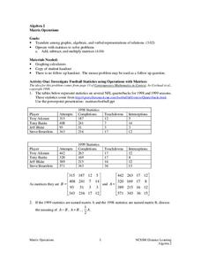 Two real-world activities to practice adding, subtracting and multiplying matrices to problem solve. Data from several Pro football quarterbacks is used in one activity to make some predictions based on their stats. Then the class takes...