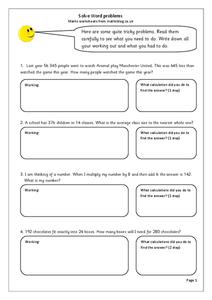 In this problem solving worksheet, students solve word problems. Students determine how to solve four word problems, solve them, and show their steps.