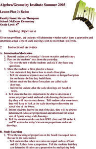 Sixth graders pariticipate in a lesson that focuses on the finding of a ratio and using it to set up a proportion in realtionship to creating a scale drawing. This is done using given problems. It would be valuable for students to have...