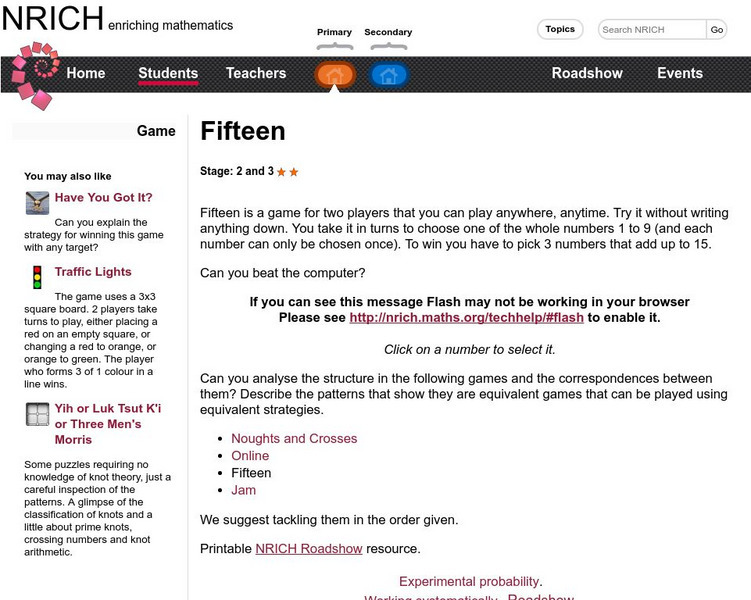 Sharpen your problem solving and strategy skills playing this interactive game, Fifteen. The rules are simple but the game requires some thinking if you want to beat the computer. There is a "Printable Page," link if you want to print it...