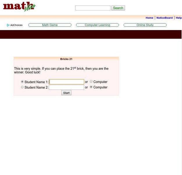 To win this strategic game you must lay the 21st brick. That is what makes this interactive game challenging. Play against the computer or a partner. Winners will have their names posted for the day.
