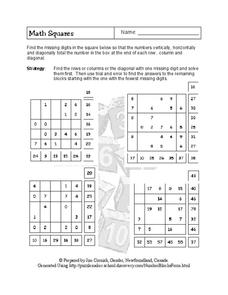 In this math worksheet, young scholars solve 4 grid puzzles in which the rows, columns and diagonals total the number at the end of each. There are helpful strategy hints on the page.