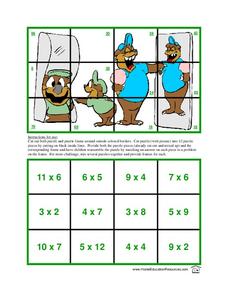 In this multiplication worksheet, students match up 12 multiplication math problems puzzle pieces to 12 pieces of another puzzle with the answers on them.