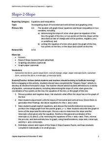Pupils build on previous experience with slope to investigate positive, negative, zero, and undefined slope. They complete a puzzle matching slope-intercept and standard forms of linear equations.