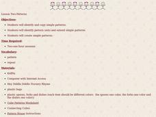 Students create and extend patterns. For this pattern lesson, students learn to identify patterns using multiple senses. Students work at centers in small groups to explore and extend their understanding of patterns.