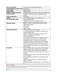 Learners identify different woods based on their density. In this density lesson, students use a triple beam balance to find the mass and a metric ruler for the volume. They look through various wood blocks and identify what type of wood...