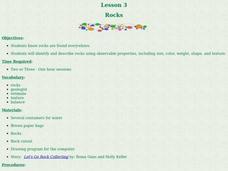 Students examine and classify various types of rocks. For this rock identification lesson, students complete a KWL chart about rocks and then read Let's Go Rock Collecting. Students go on a walk to collect rocks and then...