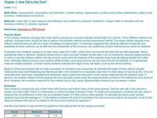 Students apply their math skills to develop an accurate estimate of the height of a tall tree. Three different methods are outlined. All grade levels should be able to perform the shadow method and the proportional method.