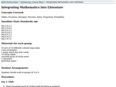 You class will read Cucumber Soup by Vickie Leigh Krudwig as an anticipatory set for this lesson on ratios. They make models of the insects in the story and then use them as a source of data for this ratio and proportion lesson. This...