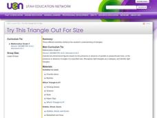 Fourth graders participate in three experiments to gain understanding of triangles. For this triangles lesson, 4th graders use pipe cleaners to create bubble pipes, basketball hoops and bingo cards to display the characteristics of...