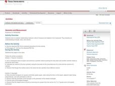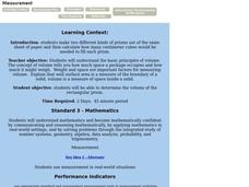 Young geometers explore relationships between units of measure and objects. Three activities provide varied opportunities to practice. Learners calculate the volume of two cylinders made by rolling a piece of paper vertically and...