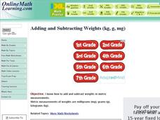 For this online math worksheet, students practice adding and subtracting metric weight values. This excellent resource allows the students to check their answers, and to get "hints" should they run into difficulties. A terrific teaching...