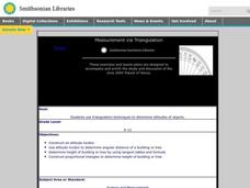 Students utilize triangulation techniques to determine altitudes of objects. An altitude locator is constructed and used to determine the height of a building or a tree. Tangent tables and formulas provide the ratio for the formula to...