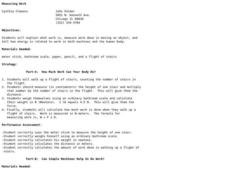 Students explore what work is, measure work done in moving an object, and tell how energy is related to work in both machines and the human body. In this measuring work lesson plan, students walk up a flight of stairs, measure the height...