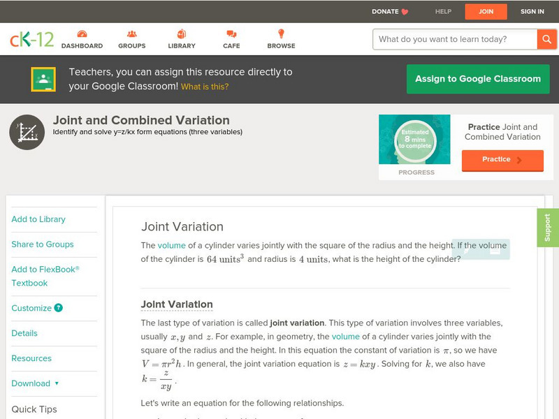 [Free Registration/Login may be required to access all resource tools.] This lesson introduces joint variation between three variables.