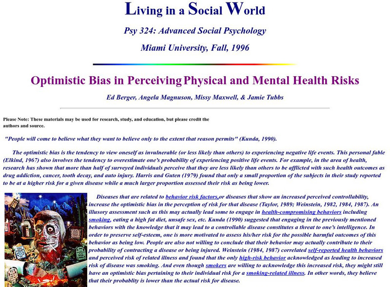 This article looks at the tendency to view oneself as invulnerable to experience negative life events. They suggest this goes hand in hand with the tendency to overestimate one's probability of experiencing postive life events. (Miami...