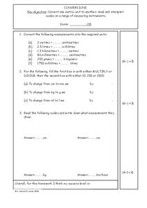 In this metric conversion worksheet, middle schoolers convert measurements within the metric system. They determine the proper procedure, multiplication or division, prior to converting. This two-page worksheet contains 11 problems.