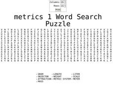 In this math and language arts worksheet, students analyze 10 terms pertaining to metric measurement. Students find them in a word search.