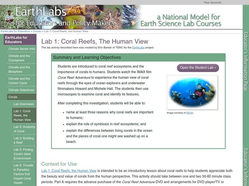 A lab experiment in a series of experiments that investigates coral. During this lab, students will experience coral reefs by watching the IMAX film Coral Reef Adventure. After watching the movie, students will examine coral and its...