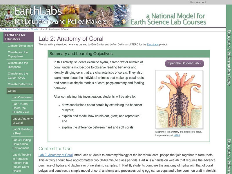 A lab experiment in a series of experiments that investigates coral. In this activity, students will use a microscope to examine the feeding behavior of a hydra, a fresh-water relative of coral. They will also observe the characteristic...
