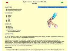 Students explore human senses. In this applied Science lesson, students utilize their senses to distinguish various objects. Students explain their descriptions.