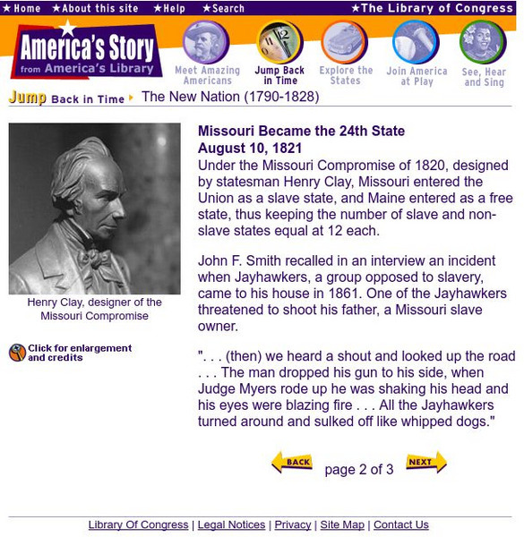 As Missouri became a state, America was divided by slavery. This site from the Library of Congress offers a description of the events, as well as a railroad map, a painting of the Missouri Squadron, and a bust of Henry Clay, designer of...