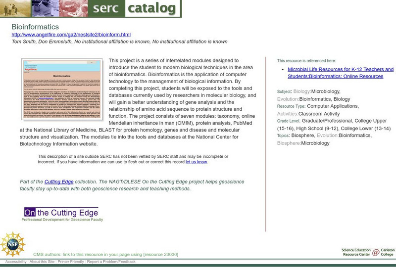 This project is a series of interrelated modules designed to introduce the student to modern biological techniques in the area of bioinformatics. Bioinformatics is the application of computer technology to the management of biological...