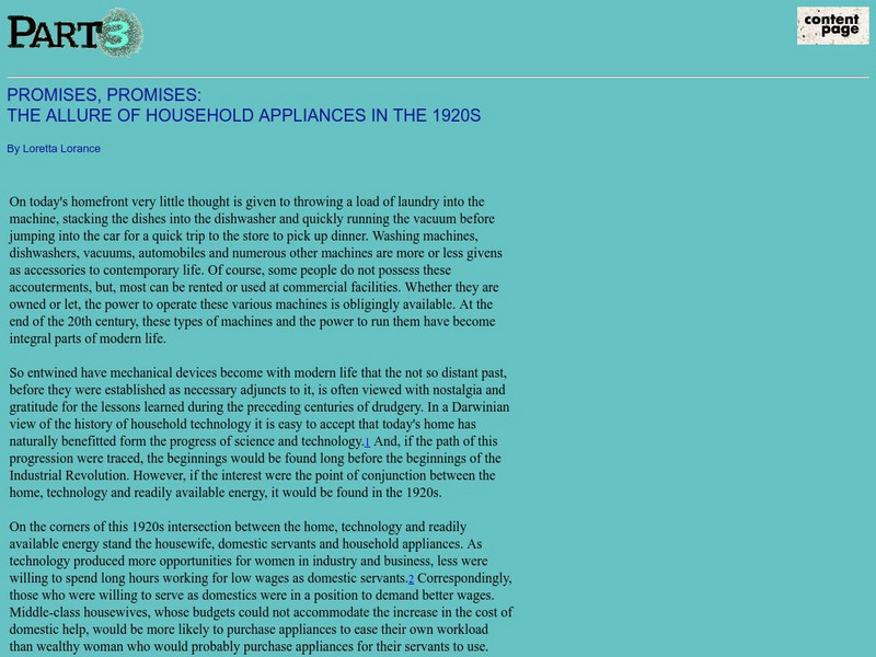 This site discusses in detail the impact modern appliances had on the 1920s American household. Technology produced more opportunities within the household. Provides information about the benefits of electricity.