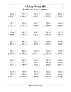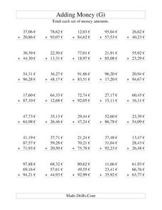 In this adding money instructional activity, students solve 20 problems in which English pounds and pence are added. Money on this page is in increments of 50 cents and there will be carrying in some problems.