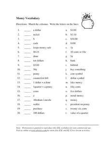 For this money worksheet, students match money vocabulary with their meanings and money amounts. Students complete 20 matches total.
