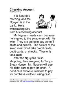 In this withdrawing money from a checking account worksheet, learners listen as the teacher reads a passage on why Mr. Nguyen is withdrawing $50 from his checking account.