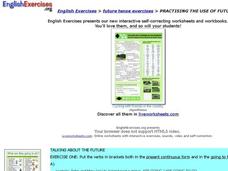 In this ESL future tense worksheet, students change verbs shown in brackets in sentences to both the "going to future" and present continuous form, and put verbs in simple future tense.