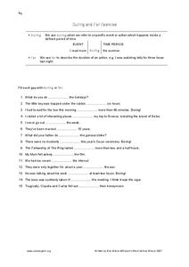 In this grammar skills worksheet, students respond to 15 fill in the blank and short answer questions regarding the use of the prepositions "for" and "during."