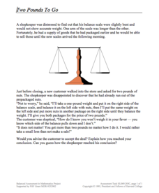 How hard can it be to measure out two pounds? A short performance task introduces a situation where a balance scale is broken. It gives a method for measuring out two pounds and asks learners to evaluate the procedure. They must prove...
