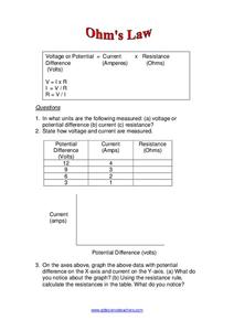 In this Ohm's Law learning exercise, learners answer 8 questions which include multiple choice, graphs, and short answer. They write the definitions of voltage, potential difference, current, and resistance. They complete a graph about...