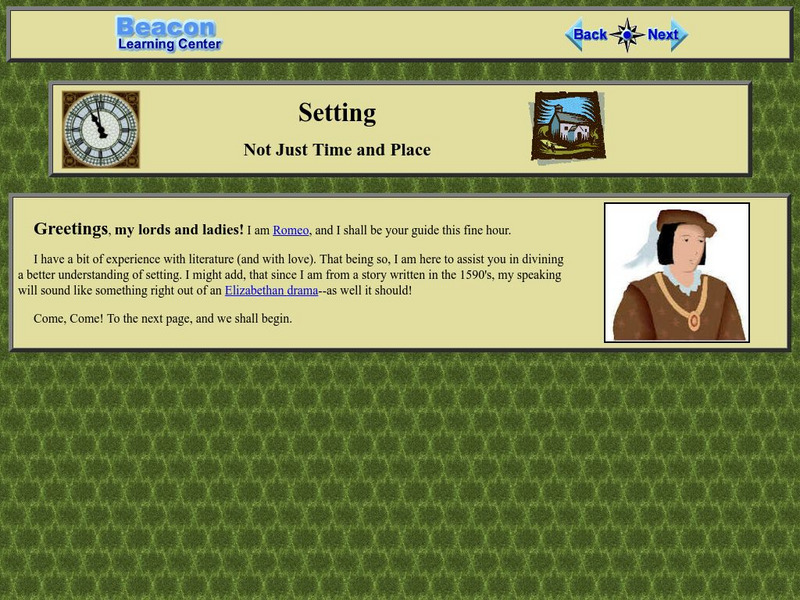 This is a tutorial focusing on setting including time, place, deeper meanings, multiple settings, etc. Shakespeare's Romeo acts as the guide. RL.11-12.3 Auth choice story elem