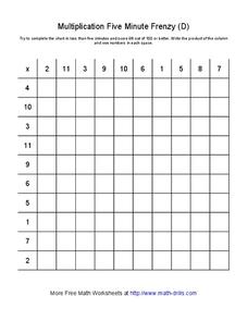 In this multiplication worksheet, students complete four 100 space multiplication charts. Students are timed for five minutes for each chart. Facts included are with factors from 1 to 12.