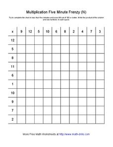 In this multiplication chart worksheet, students fill in multiplication charts that contain numbers 1 through 12. Students try to fill in 4 charts in 5 minutes each.