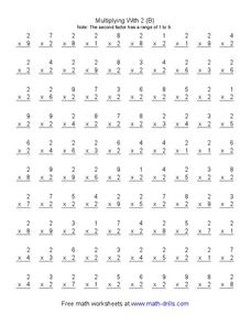 In this multiplying whole numbers worksheet, students multiply one-digit numbers times two. Students find the products for 100 problems.