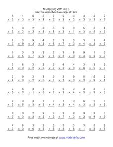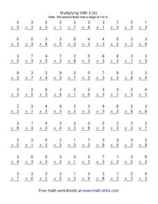 In this multiplying whole numbers instructional activity, students multiply one-digit numbers times three. Students find the products for 100 problems.