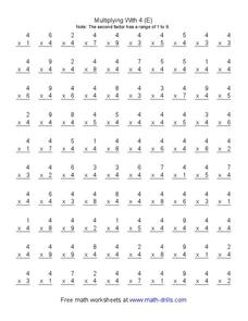 In this multiplication facts practice activity, students solve 100 problems that require them to multiply numbers within the range 1-12 by the number 4.