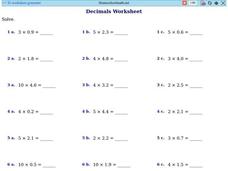 In this multiplication of decimals activity, students complete 6 sets of problems. The first two sets of ten problems involve whole number computation. The final four sets involve decimal multiplication. There are a total of 59...