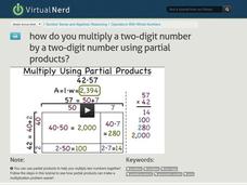 What are partial products? The teacher uses a geometric model to illustrate how to break up double digit numbers to find the product of the numbers being multiplied. It's a good visual for your students who might need to see how the math...