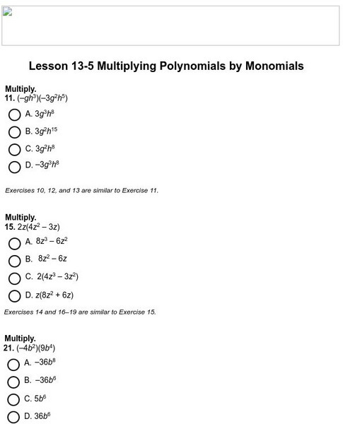 Glencoe Mathematics: Online Study Tools: Multiplying Monomials and Polynomials