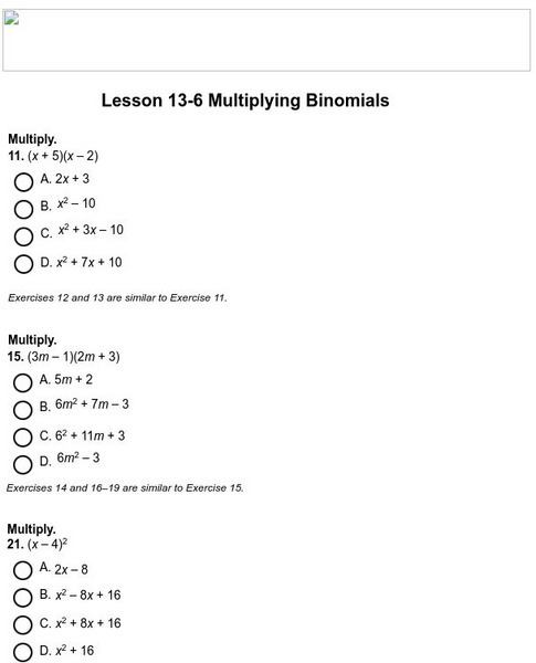 Holt, Rinehart and Winston: Homework Help Independent Practice: Multiplying Binomials
