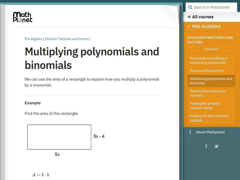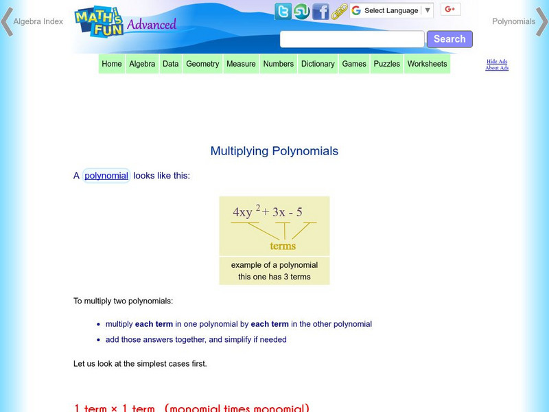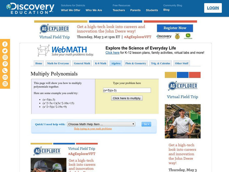 This WebMath interactive site allows students to enter problems and get an answer. It offers tips on how to multiply polynomials.