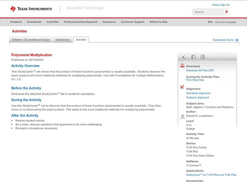 [Free Registration/Login may be required to access all resource tools.] In this lesson students multiply binomials vertically, horizontally and through a table. Students examine guided notes, review guided practice, watch instructional...